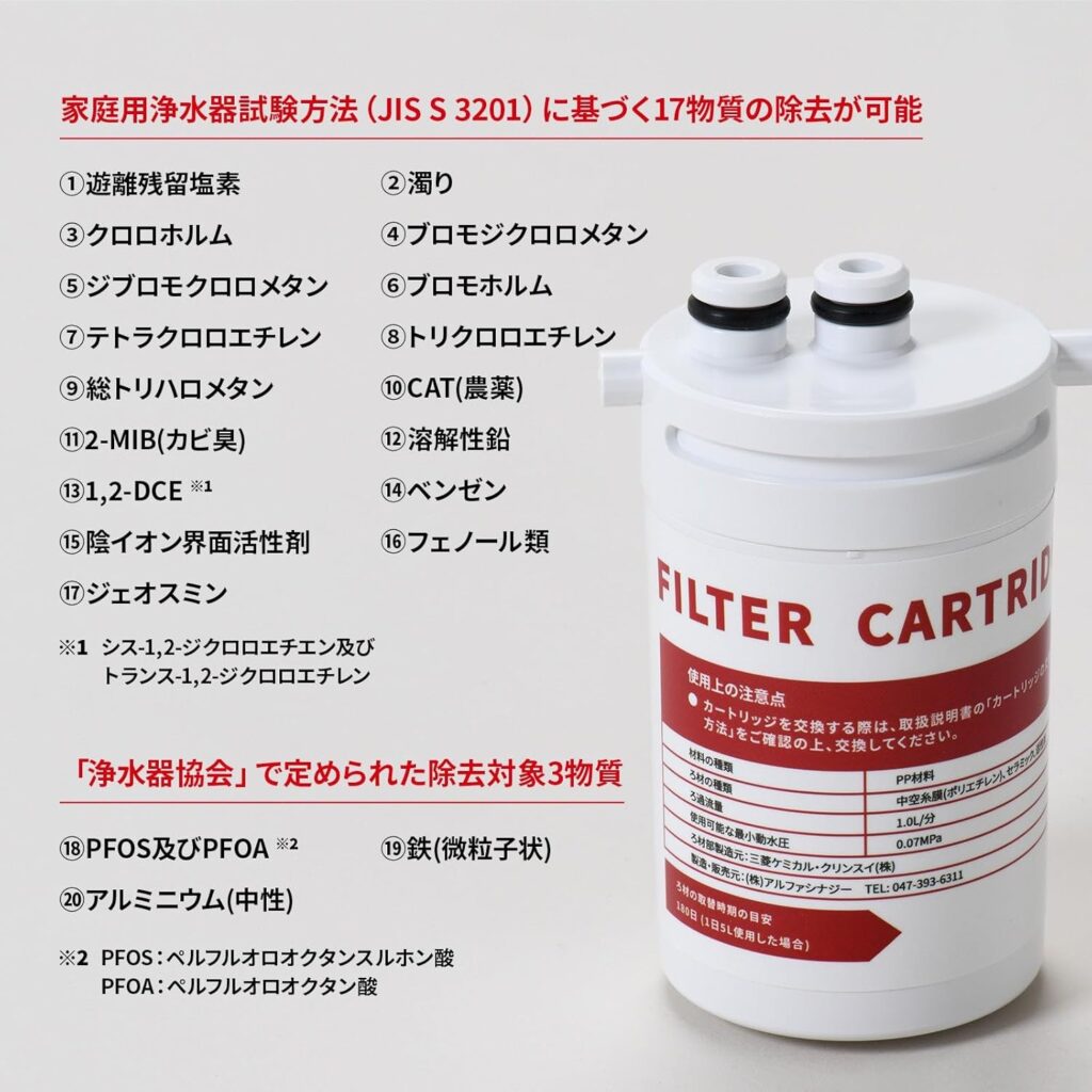 | フィルターの浄水能力 | 遊離残留塩素 濁り クロロホルム ブロモジクロロメタン ジブロモクロロメタン ブロモホルム テトラクロロエチレン トリクロロエチレン 総トリハロメタン CAT(農薬) 2-MIB(カビ臭) 溶解性鉛 1,2-DCE ベンゼン 陰イオン界面活性剤 フェノール類 ジェオスミン PFOS及びPFOA 鉄(微粒子状) アルミニウム(中性) |
